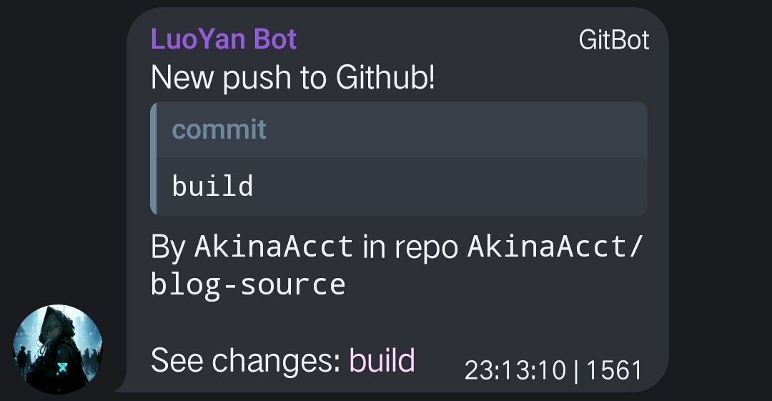 再跑一次。成功了!一股喜悦冲击着你的心灵!恭喜你!你现在有了一个 转发 GitHub 提交信息的 Bot了!