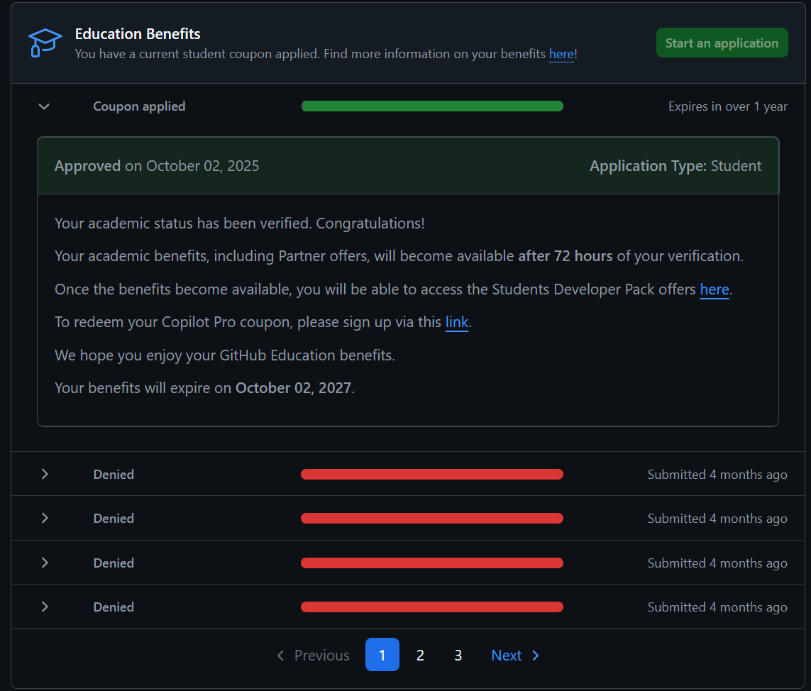 顺便挖个坑,我已经拿到了 GitHub Student 资格。等我有时间了写一篇在申请中的一些坑。放一张试了 12 次终于通过的的截图。